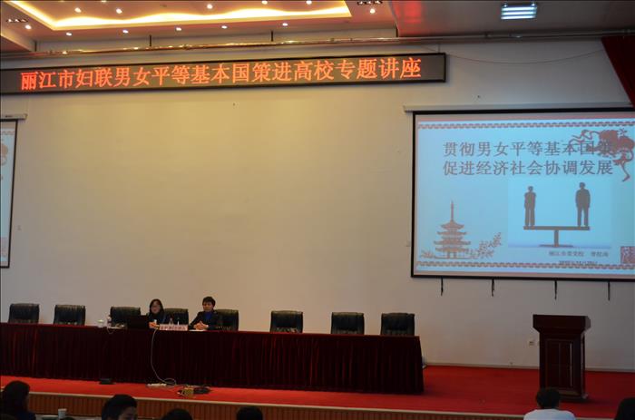 今年是我国实施男女平等基本国策20周年,为进一步保障妇女权益、促进妇女发展、推动男女平等,11月20日下午,丽江市妇联在我校图书馆报告厅举行“男女平等基本国策进高校专题讲座”。中共丽江市委党校外训部曾松涛副主任做了题为《贯彻男女平等基本国策,促进经济社会协调发展》的专题讲座,丽江市妇联妇儿工委办专职副主任胡英、维权科科长曹建秋也到讲座现场,我校400多名师生认真聆听了专题讲座。