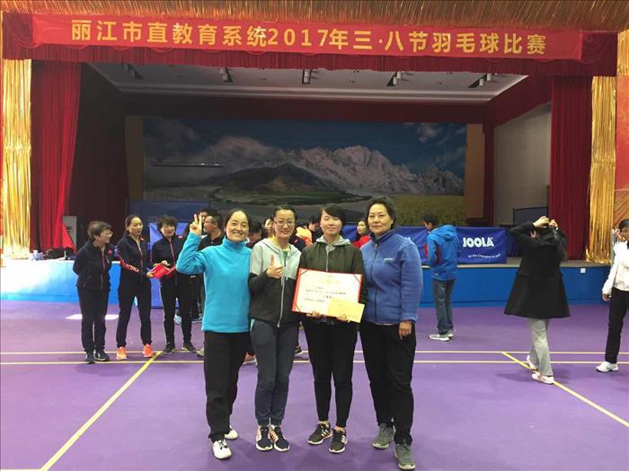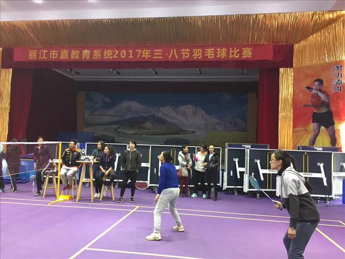 近日,由丽江市教育工会组织的“健康女性 巾帼建功”三.八节女教职工羽毛球比赛在丽江市实验学校乒乓球馆举行。来自丽江市直学校、市教育局机关、在丽高校的十家单位的女职工代表队参加了羽毛球比赛。我校选派了六名女教职工参加比赛。