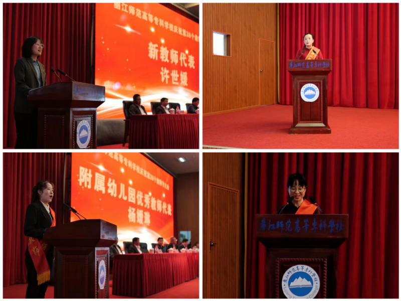 优秀教师代表熊娅莉、附属幼儿园优秀教师代表杨嫒琳、优秀辅导员代表赵冬娇、从教35周年教师代表杨丽萍、新进教师代表许世媛先后发言。