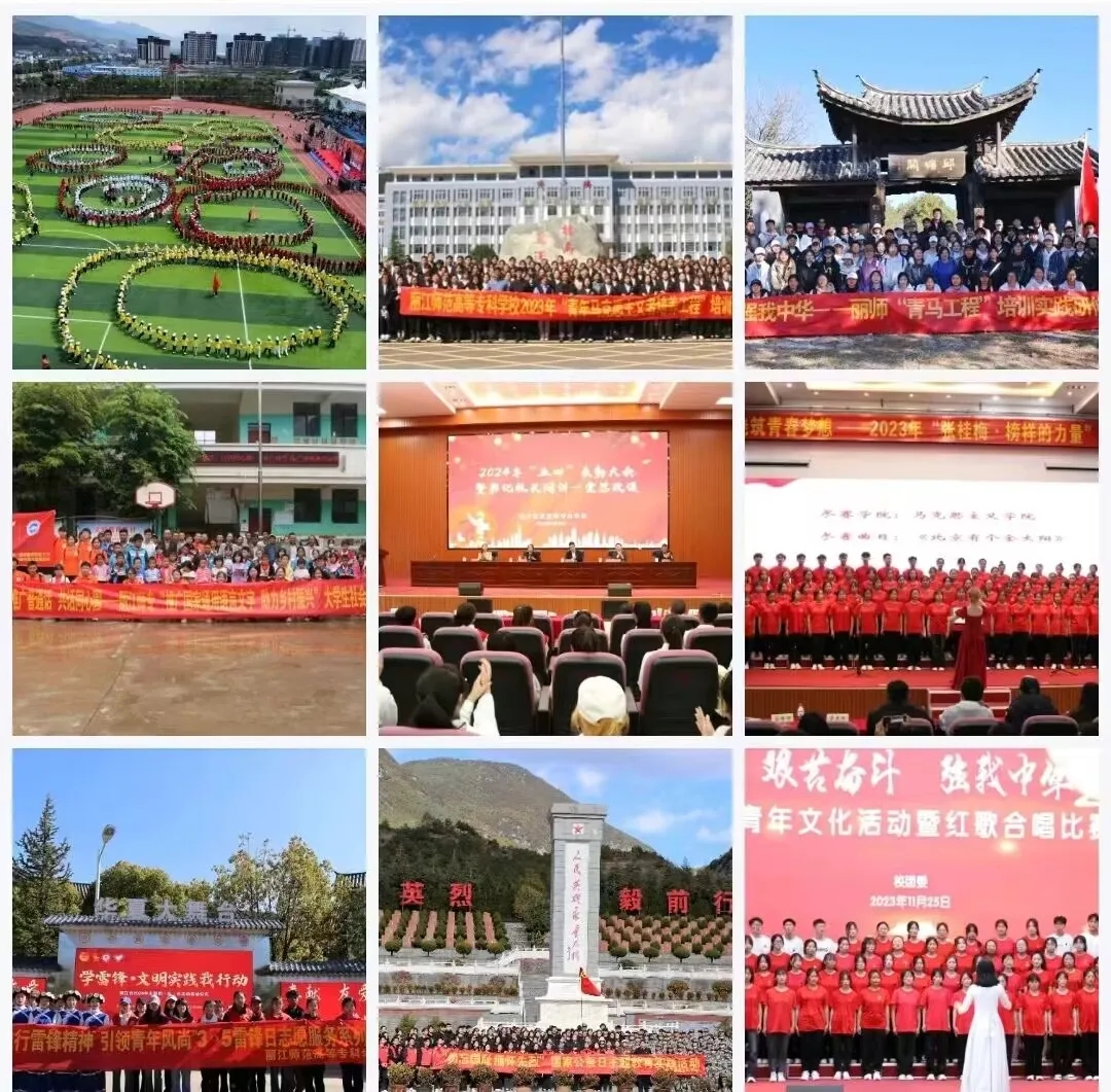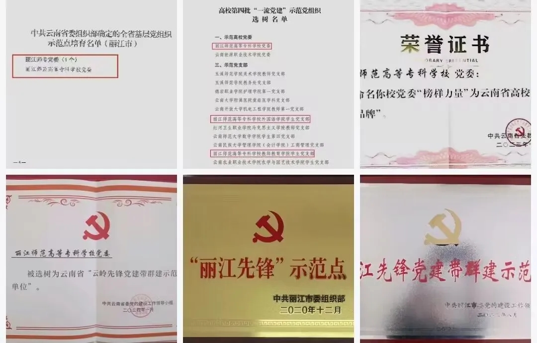 【工作成效】学校党委入选“全省基层党组织示范点培育名单”,被选树为“云南省高校第四批一流党建示范高校党委”,被评为“丽江先锋示范点”,学校党建品牌“榜样力量”被命名为云南省高校“党建工作品牌”,学校党委书记连续三年抓基层党建被评为“好”。学校被选树为云南省第一批“云岭先锋党建带群建示范单位”、“丽江先锋党建带群建示范点”,学校工会和五个学院被评为“丽江市党工共建党建示范点”。学校共青团2023年度工作获省级“优秀”等次;学校“青春健康教育示范基地”荣获“全省巾帼文明岗”称号。荣获全国“最美家庭”1户、省级“最美家庭”“清廉家庭”“健康家庭”“书香家庭”等6户、市级“最美家庭”“清廉家庭”“绿色家庭”“健康家庭”“书香家庭”“抗疫最美家庭”等16户。